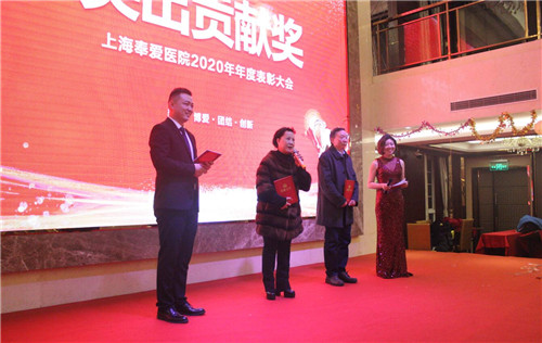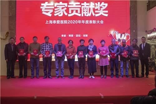其次是颁发上海奉爱医院专家贡献奖,由原上海奉城医院院长、上海奉爱医院顾问王永斌先生,公司董事长詹群瑛先生给专家颁奖,获奖的专家有:原奉贤中心医院神经内科顾春江教授,原奉贤中心医院大外科主任李家栋教授,原奉贤中心医院心血管内科薛昭平教授,原奉贤中心医院CT专家金东虎教授,原奉贤中心医院外科钱敏主任,原奉贤中心医院消化内科孙卫丽主任,原奉贤中医医院妇科朱丽华主任,原奉城医院中医科赵应川主任,原奉城医院消化内科宋芹书主任、医务科盛雪琴主任,康复科傅根娣主任等;